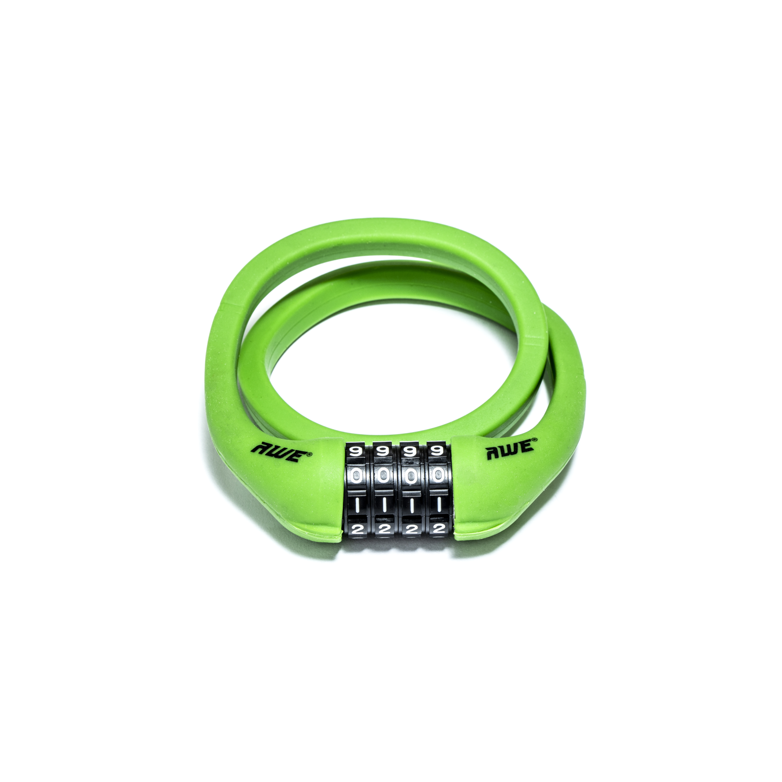 Awe Bicycle Combination Lock AWLK20 Cable Locks & Clips Depth:3.2cm Height:18.4cm Weight:0.23kg Width:12.2cm Made from high quality flexible TPE cable which can be put into any shape and it will stay in that position 4 digit combination which is re-settable Silicone cover in green to protect your bicycle The security grade of this lock is level 2.