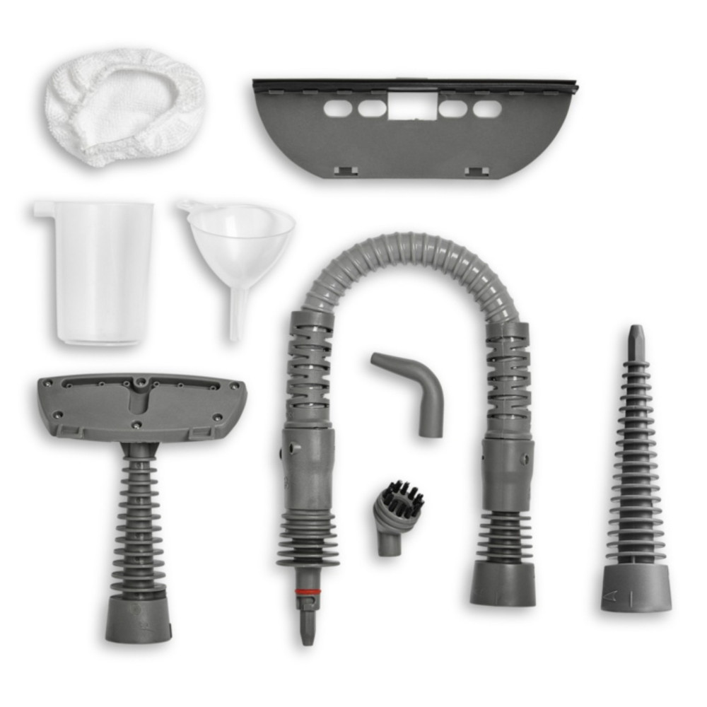 • There are 9 accessories included with an extension hose, fabric steaming tool, microfibre cloth, long nozzle attachment, nylon brush, squeegee, angled nozzle, funnel and a measuring cup to expand your cleaning arsenal.