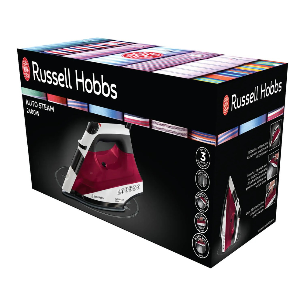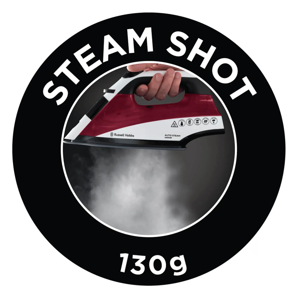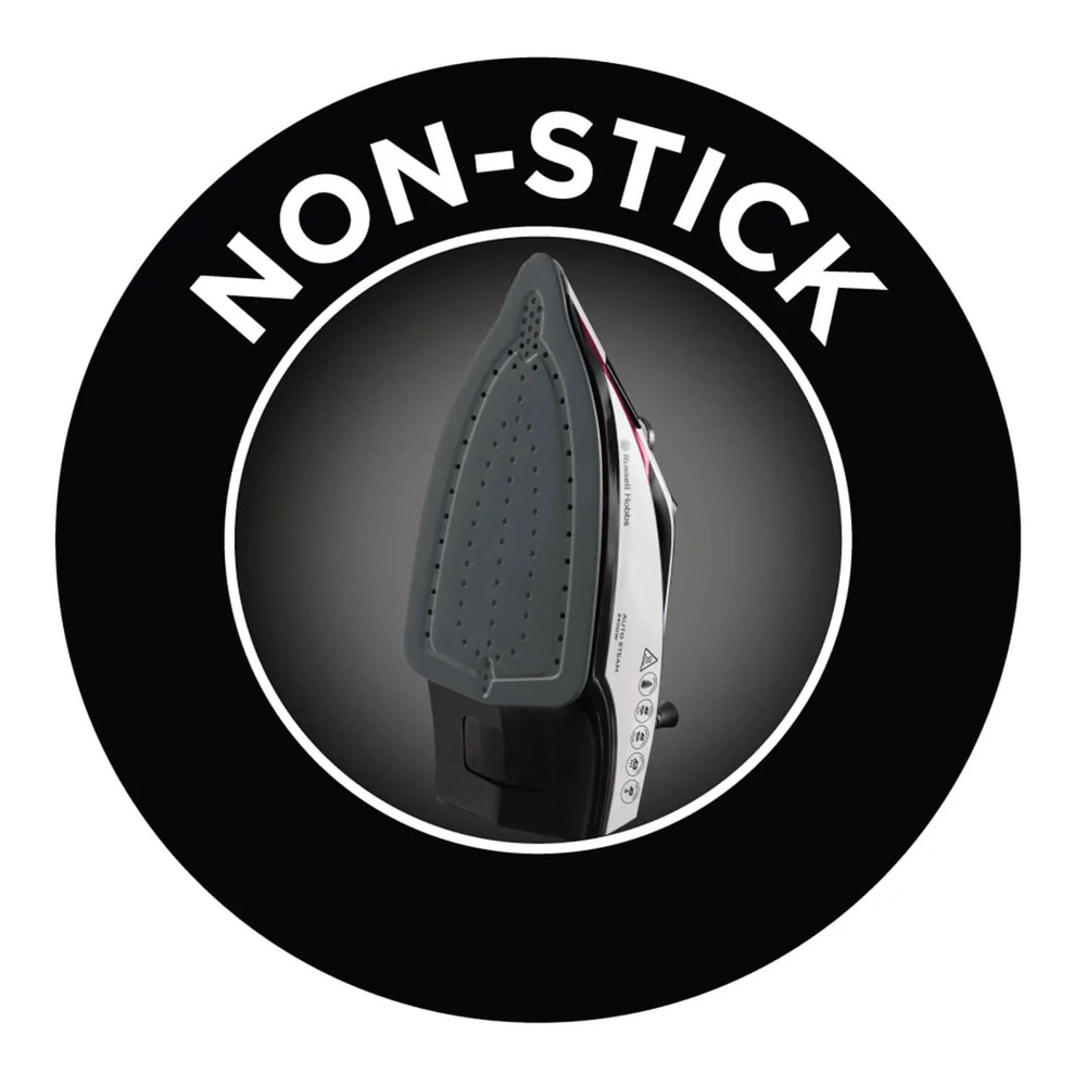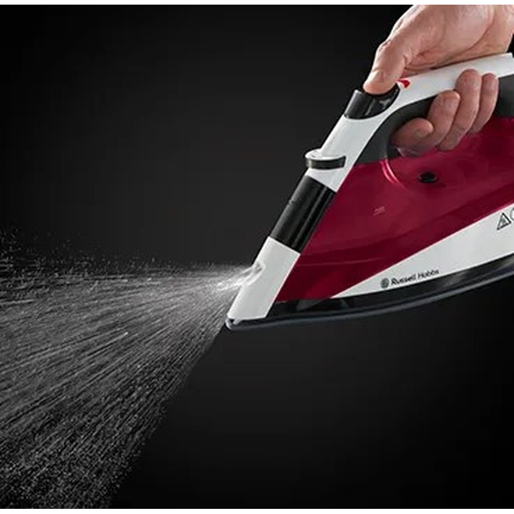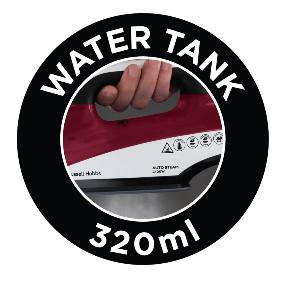 The 2400w Russell Hobbs Iron features a non-stick soleplate and provides 45g/min continuous steam with a 130g/min steam shot, effectively removing creases from tough fabrics like denim. Its 320ml water tank allows for tackling large ironing loads without frequent refills, and the anti-drip feature prevents water marks on garments.