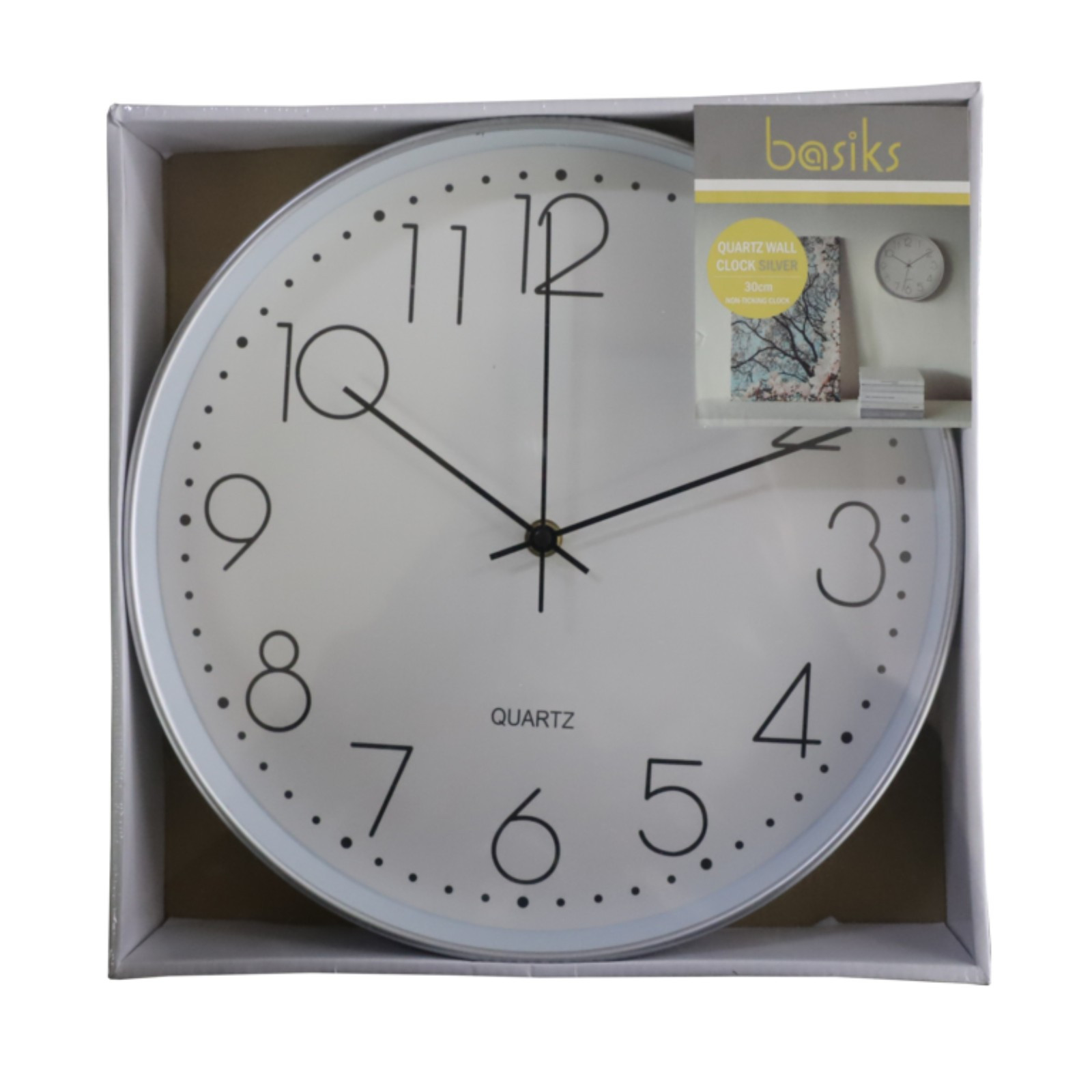 Basiks 30cm Quartz Wall Clock Silver, Non ticking clock. For indoor use only.