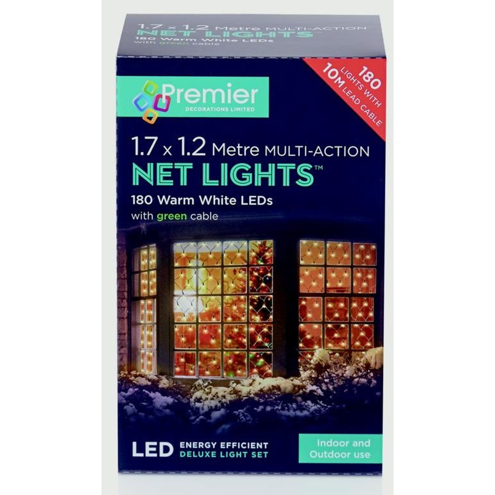 1.7 x 1.2 Metre MULTI-ACTION, NET LIGHTS. 180 Warm White LEDs with green cable. 180 LIGHTS WITH 10M LEAD CABLE, ENERGY EFFICIENT.