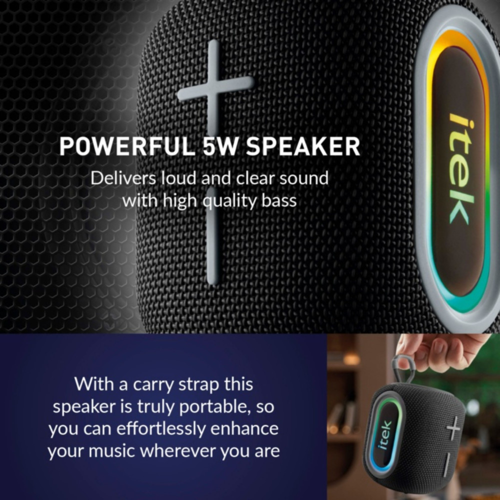 The iTek Bluetooth Black Speaker & LED Lights 5W creates a vibrant party atmosphere with its powerful sound and light features. It connects to Bluetooth devices within 10m and includes AUX, USB, and Micro-SD options for versatile music playback. The 5W speaker delivers loud, clear sound with deep bass, complemented by 7 light modes for a fantastic display.