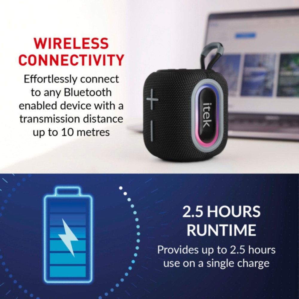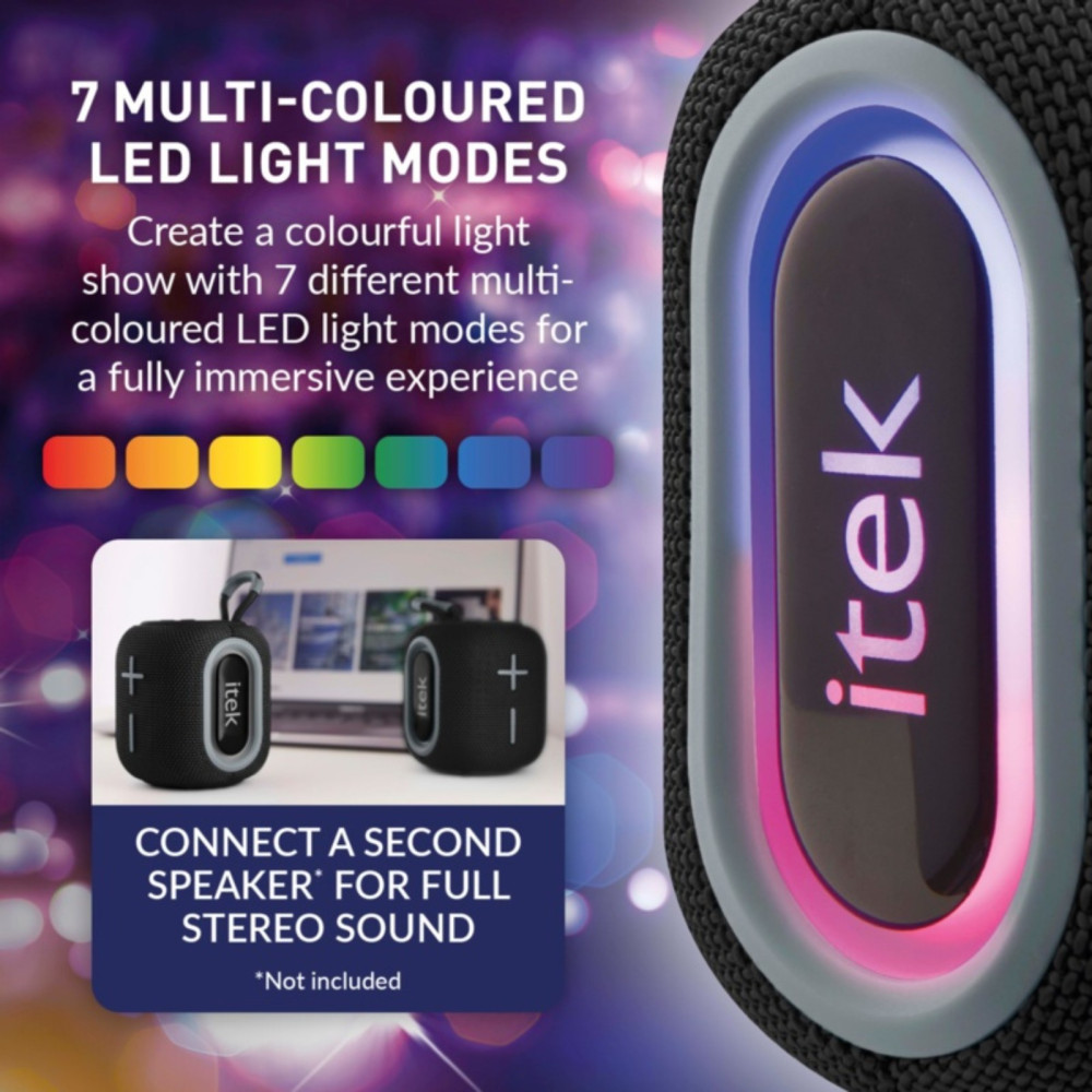 The iTek Bluetooth Black Speaker & LED Lights 5W create a vibrant party atmosphere for your friends and family with the Vibes Portable Speaker from iTek. Capable of connecting to any Bluetooth device with a 10m transmission distance, you can connect and play your favourite party songs.