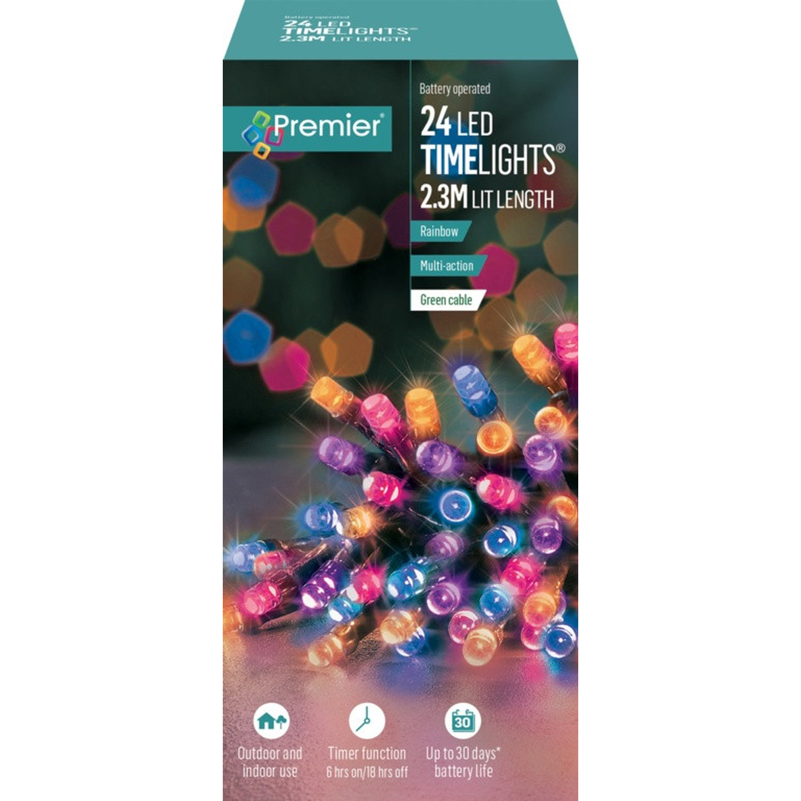 Christmas lights come on at a time of your choosing. Push button timer function: 6 hours on / 18 hours off. Multi-action control unit with 8 light sequences. Waterproof battery box for indoor and outdoor use. Bulb spacing: 10cm,Battery box to first bulb: 0.3m