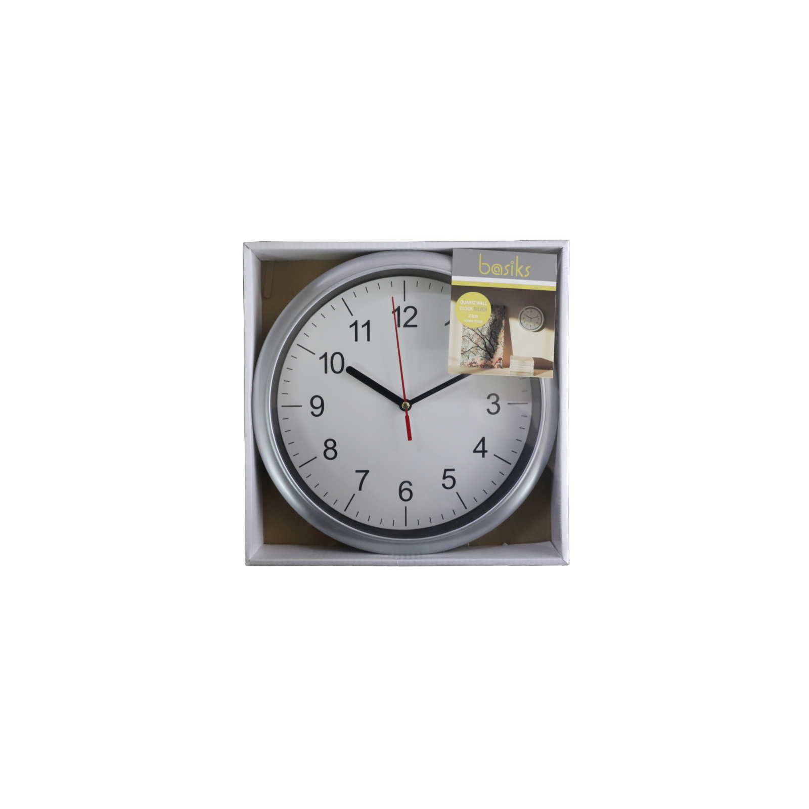 Basiks 23cm Quartz Wall Clock Silver BC5 Wall Clocks Depth:24cm Height:3.5cm Weight:0.27kg Width:24cm Ticking clockIndoor