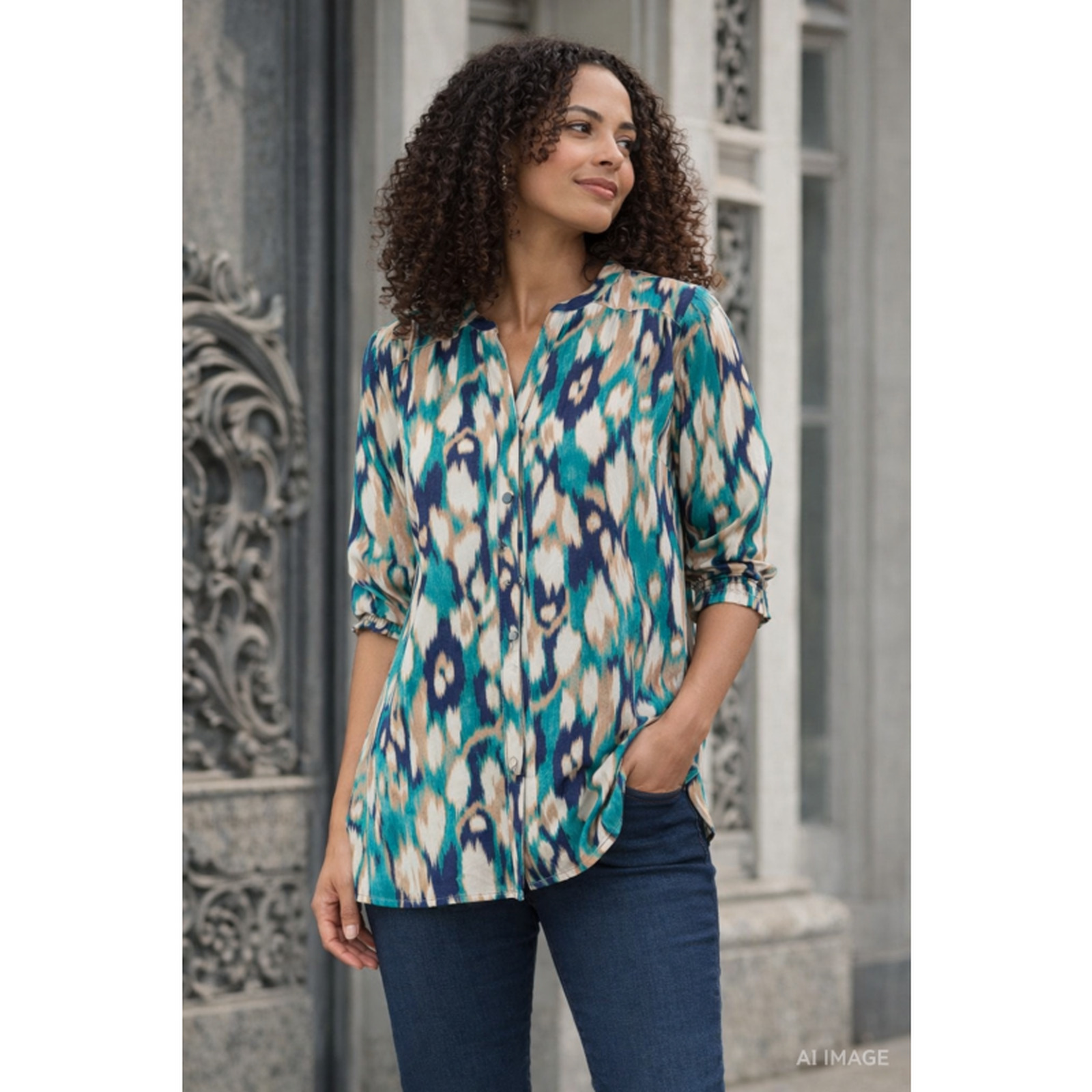 Green Abstract Print Blouse with 3/4 Sleeve - Casual & Dressy Occasions
