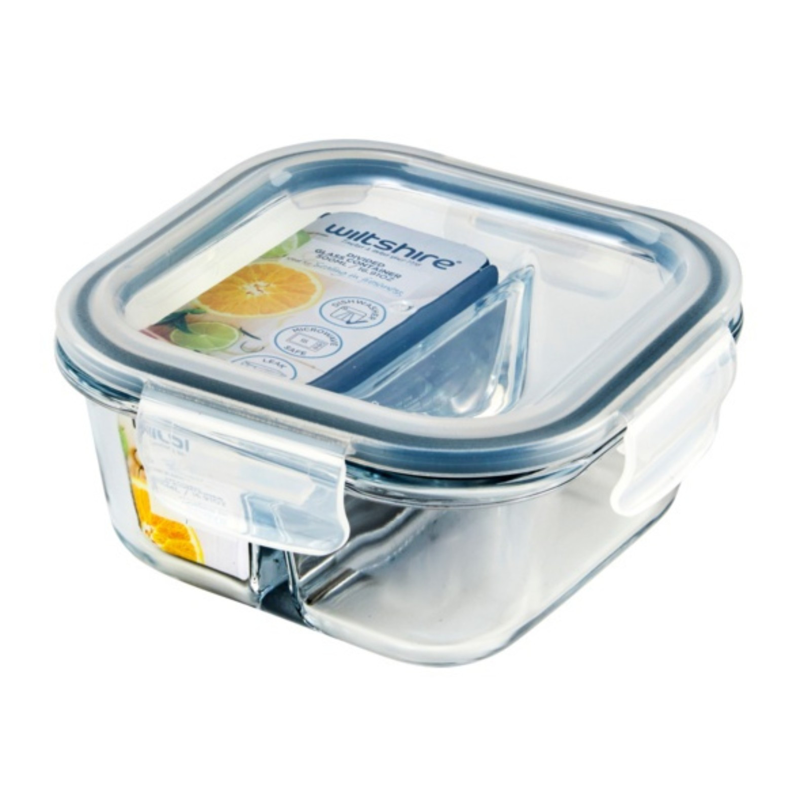Introducing the Wiltshire Square Glass Food Container, a 500ml borosilicate glass solution for food storage. It has two compartments for separating foods, is safe for the freezer, dishwasher, and microwave, and features a stackable design for efficient storage. Ideal for home cooking and on-the-go meals!
