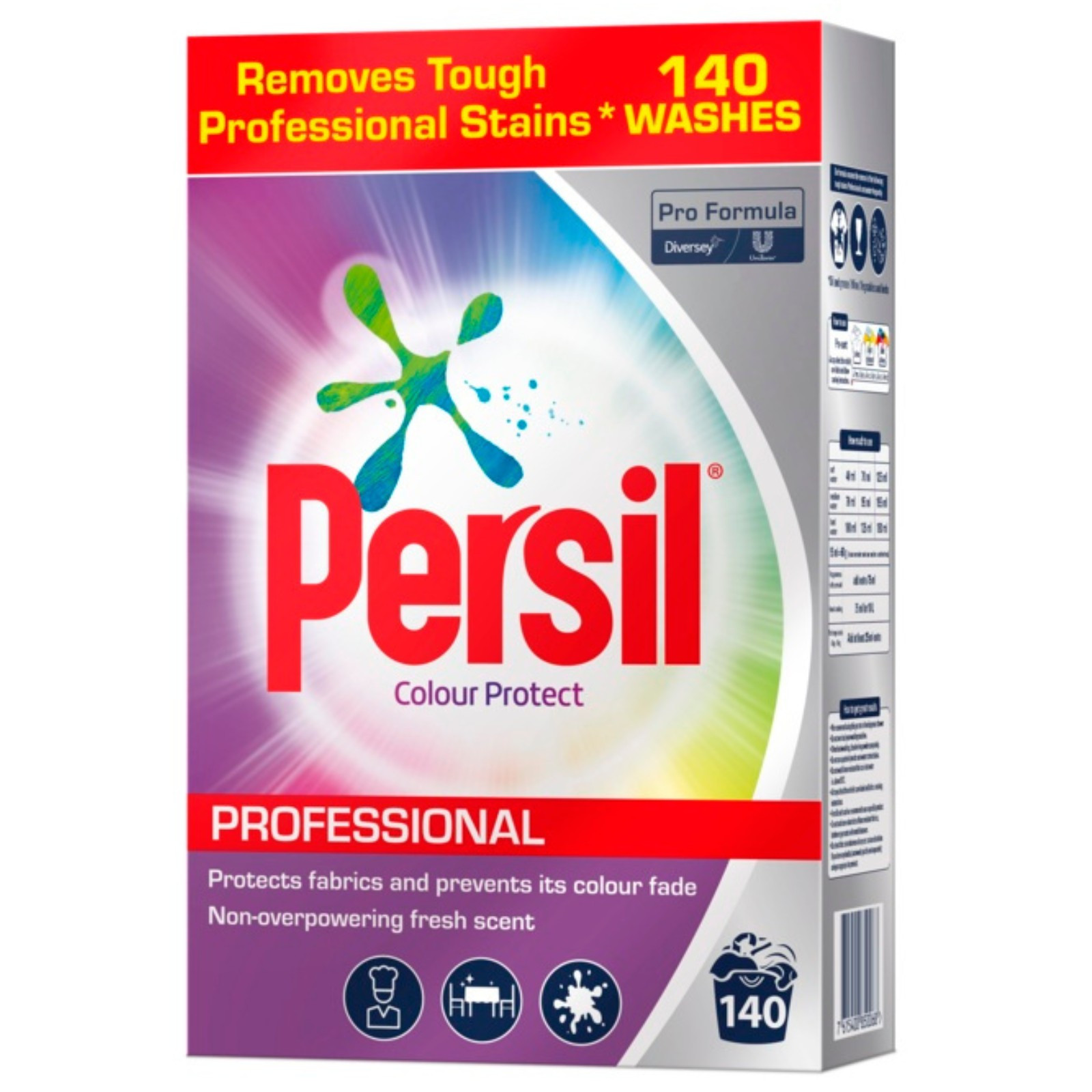 The Persil Professional Colour Care washing powder effectively eliminates stubborn professional stains for up to 140 washes. Safeguards fabrics while preventing color fading. Features a subtle, refreshing scent. Pro Formula with Color Protection.