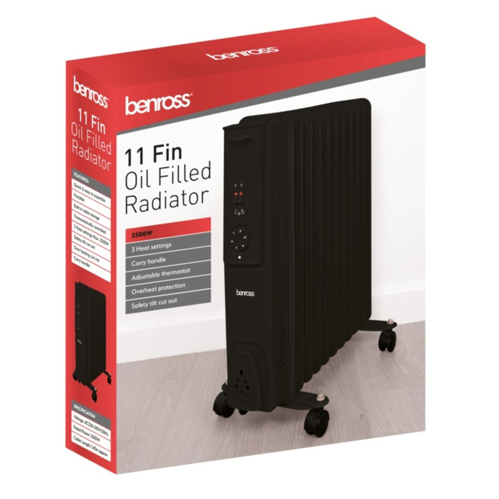 This 11-fin oil-filled radiator delivers up to 2500W of power with three adjustable heat settings. It includes built-in safety features like tilt and overheat cut-out protection. The design also features integrated cable storage with a 1.45m cord for easy handling. The sleek black finish adds a modern touch.