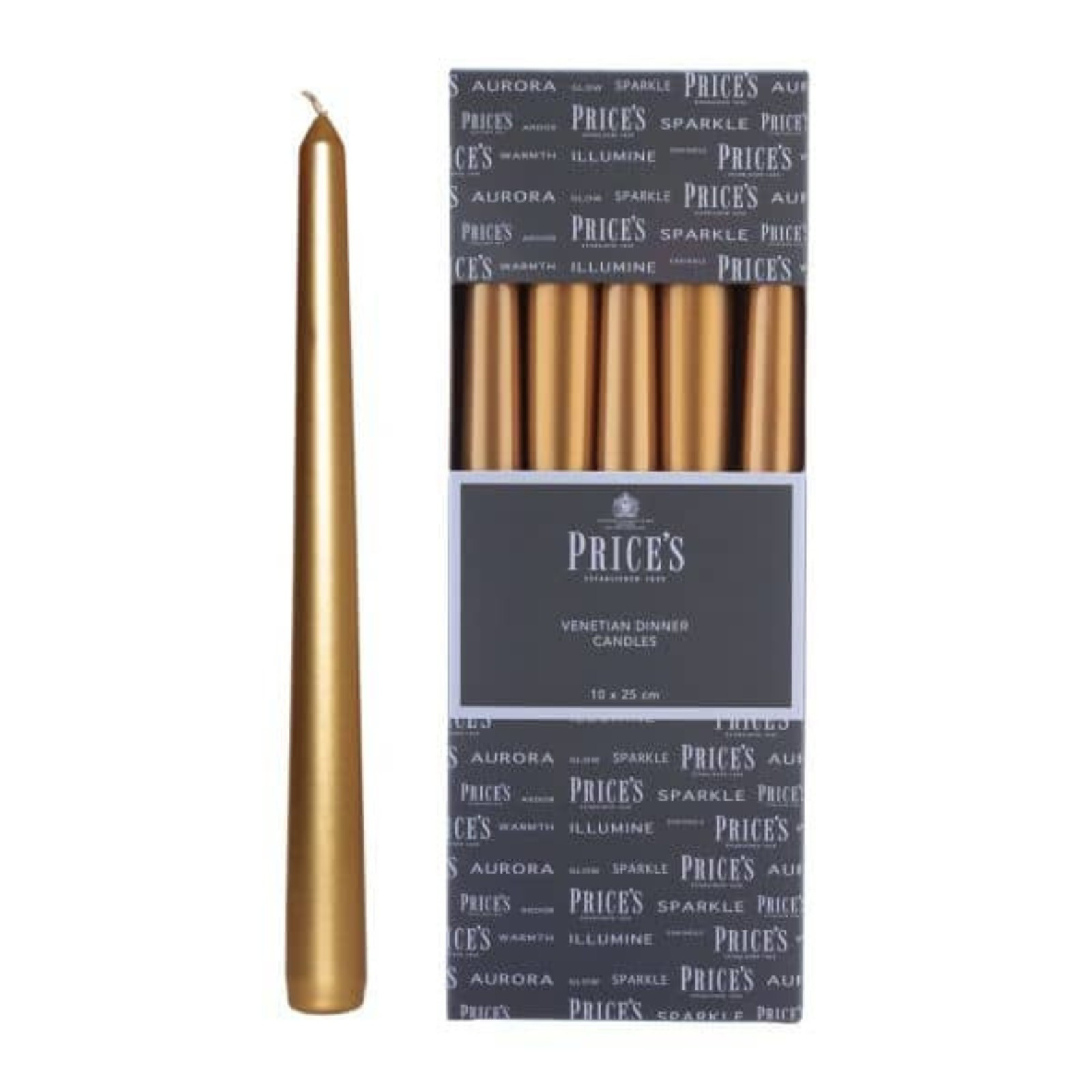 Price's 10" Venetian Wrapped Dinner Candles 10 pack high quality Venetian tapered dinner candles are coloured throughout in a beautiful Gold colour. These candles are 254mm in length and taper down to 20mm wide at the base.