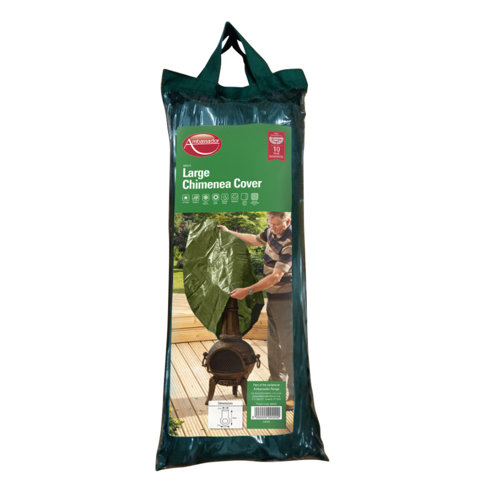 Ambassador Large Chimenea Cover 21cm x 122cm x 21cm is 210D polyester, PU coating, Cord tie, comes with 10 Year Guarantee.