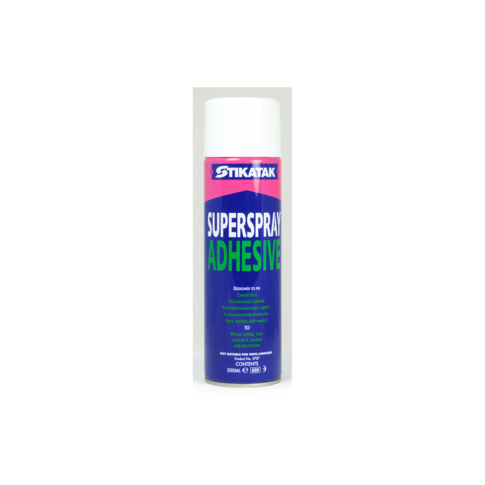 Stikatak Superspray Adhesive 500ml S707 Super Glue Weight:0.44kg General purpose aerosol adhesive DCM and CFC free for perimeter fixing of felt and foam backed carpets, underlays and tilesCan also be used with foam, floor lining paper, textiles and fabrics to wood, stone, tiles and concrete (not to be used for expanded