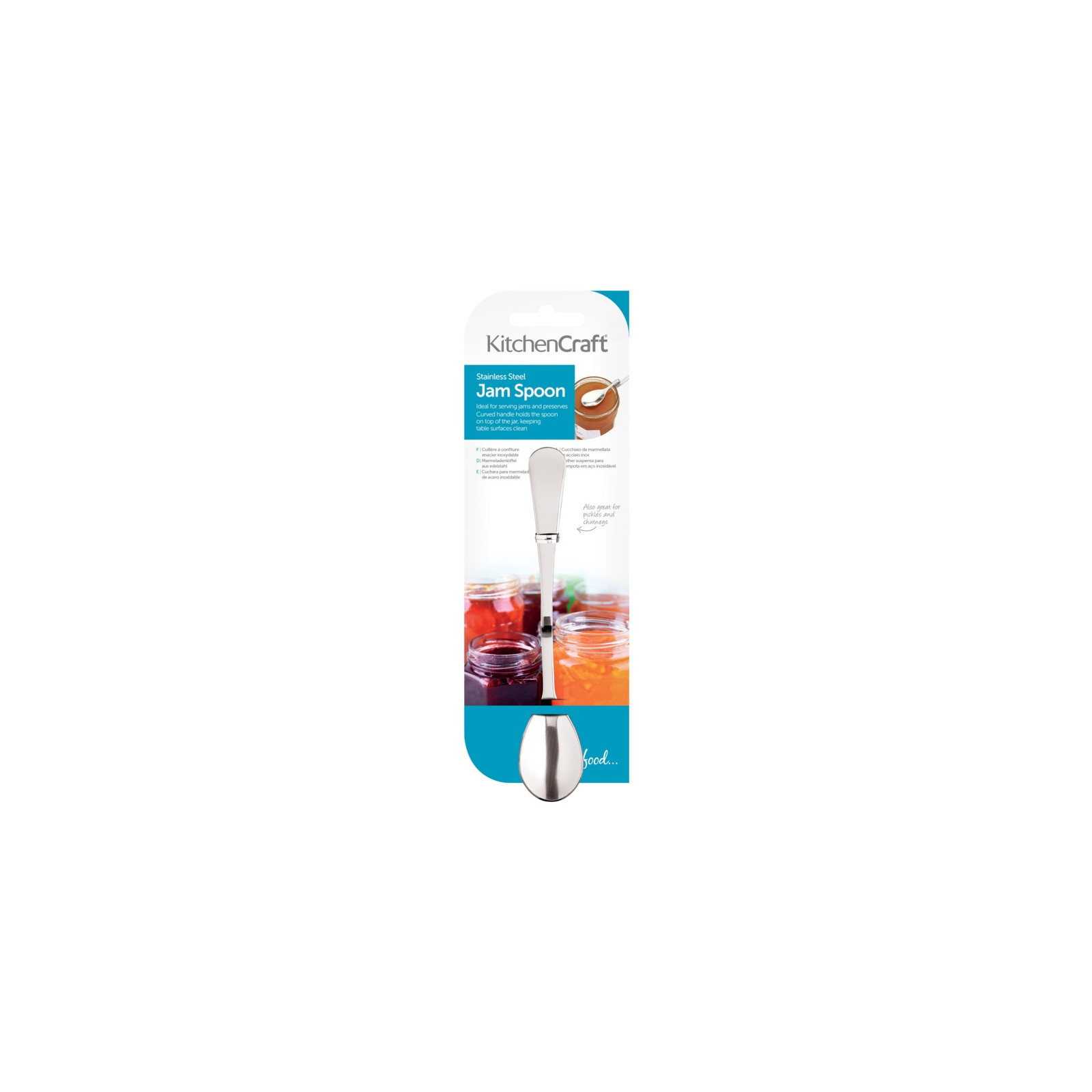 Specifically designed jam and preserve spoon with a curved handle to hold the spoon securely on jar rims, keeping your table surfaces clean, and allowing the remaining jam to drop off the end of the spoon directly back into the jar.