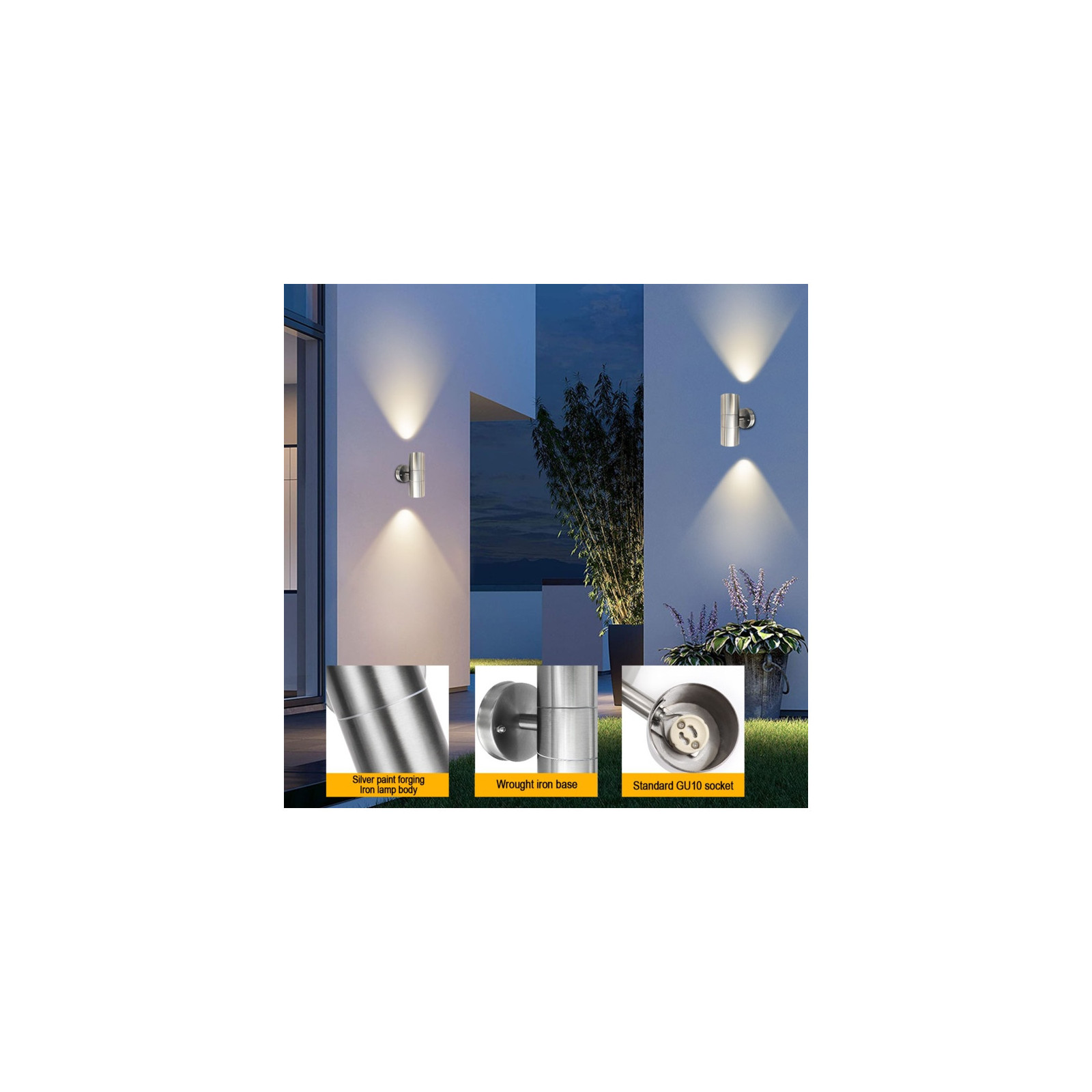 The wall lamp is equipped with GU10 standard base. Made from aluminium, Modern and elegant design. AC power source, IP44 waterproof level.