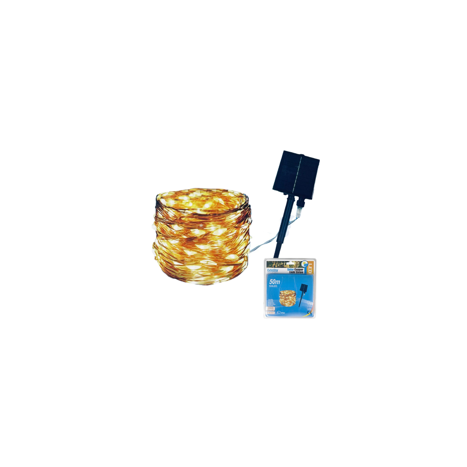 500 micro LEDs on a 50 meters copper wire string, 8 modes, Solar powered, Illuminates automatically at dusk, IP44 waterproof level, Colour temperature: Warm White 3000K.