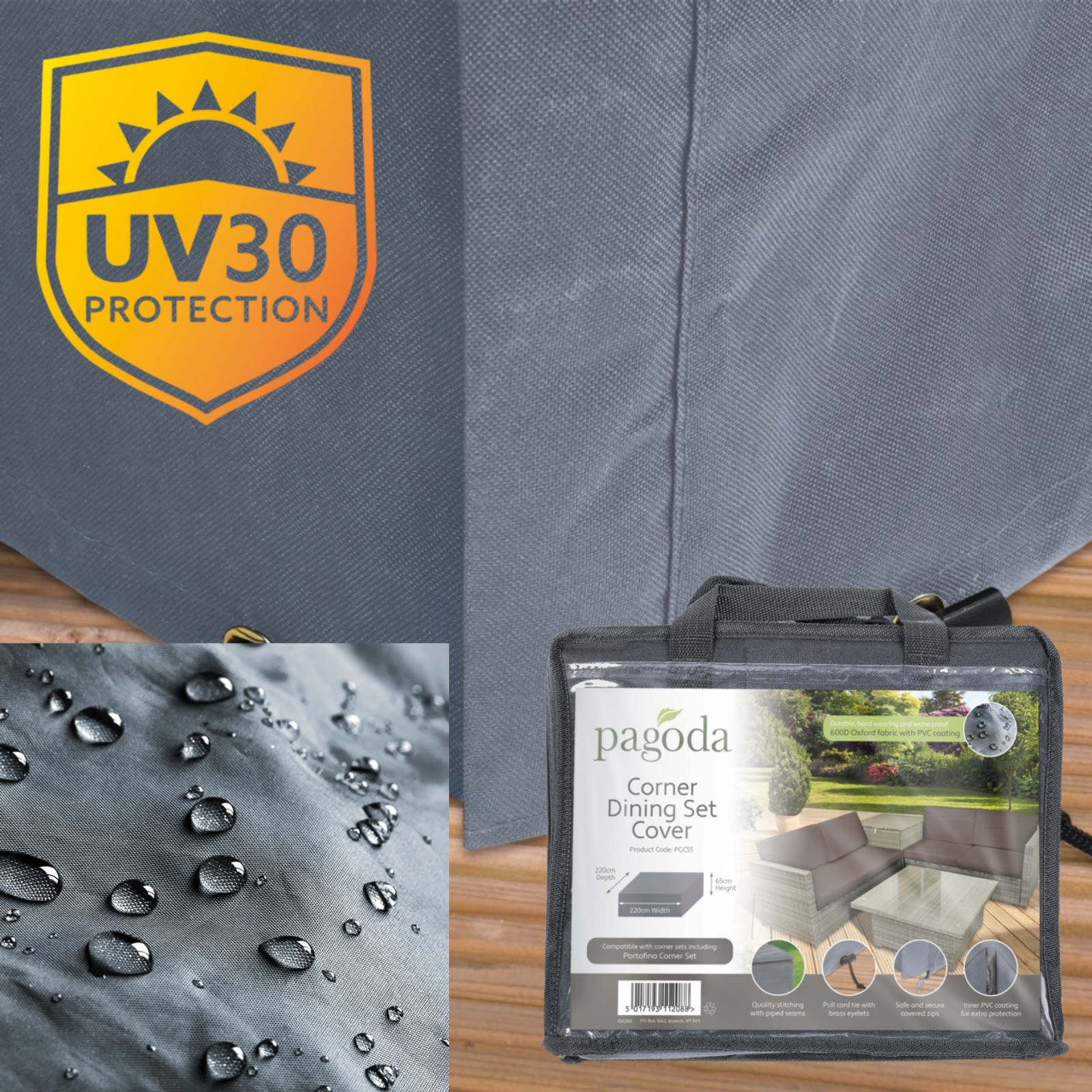 Protect your outdoor furniture with the Pagoda Corner Dining Set Cover, designed to fit 220 x 220 x 65 cm sets. This cover ensures durability with its 600D Oxford fabric and inner PVC coating, providing excellent UV30 protection against the sun. The pull cord tie with brass eyelets and safe, secure covered zips offer a snug fit, while quality stitching with piped seams adds a touch of elegance and strength. Keep your dining set safe from the elements all year round with this reliable and stylish cover.