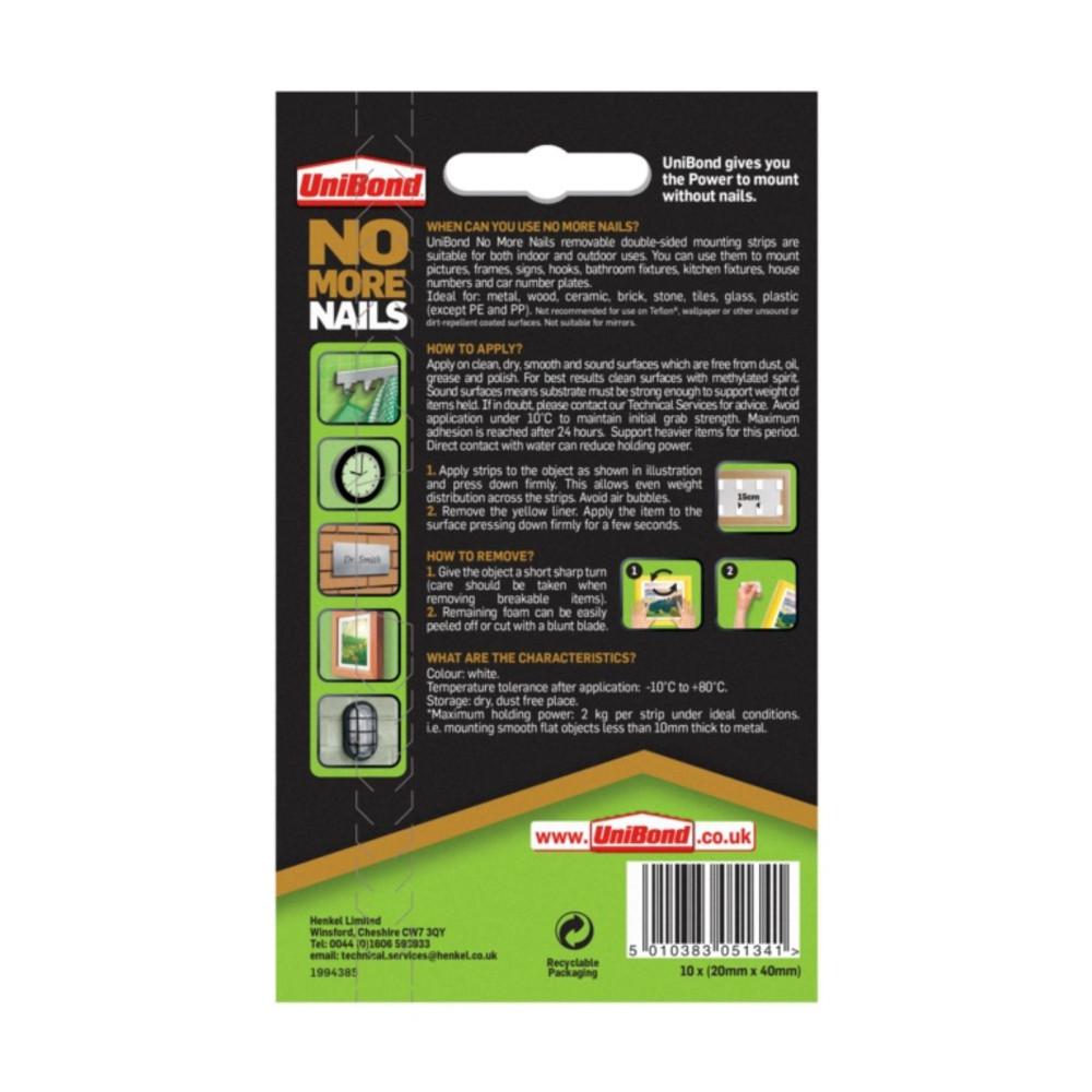 No More Nails removable strips are suitable for indoor use. Its formulation offers a strong grab strength to hold the weight of the item, as well as malleability to remove the strip when desired.